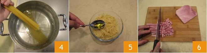 Enquanto isso, cozinhe a massa em bastante água fervente, salgada a gosto 4, por no máximo 3-4 minutos. Escorra e coloque em uma tigela, adicione a parte restante do óleo 5, para não grudar os espaguetinhos, e deixe esfriar. Corte o presunto em cubos de cerca de 5-6 mm 6.