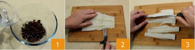 Para preparar os bolinhos de bacalhau com passas, coloque as passas em uma bacia e cubra com água morna para amolecê-las 1; deixe as passas de molho por pelo menos 30 minutos para reidratá-las. Em seguida, prossiga com a limpeza do peixe. Pegue o bacalhau dessalgado e com uma faca retire a pele 2. Corte o peixe em tiras 3;