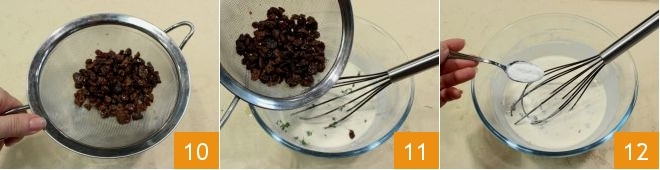 Após 30 minutos, escorra e esprema as passas 10 e adicione-as à mistura 11 junto com o fermento 12, continuando a misturar com o batedor.