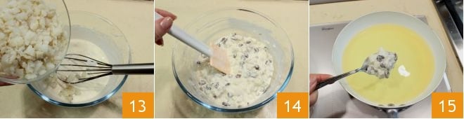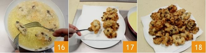 Por fim, adicione o bacalhau 13 e, com uma espátula, misture bem todos os ingredientes 14. Em uma frigideira grande, aqueça bastante óleo e, com um termômetro de cozinha, verifique se a temperatura não ultrapassa 175°-180°C. Com uma colher, despeje delicadamente a massa no óleo quente 15; frite poucos bolinhos de cada vez para evitar que a temperatura do óleo caia. Repita a operação até que a massa termine: você deverá obter cerca de 22 bolinhos de bacalhau e passas.