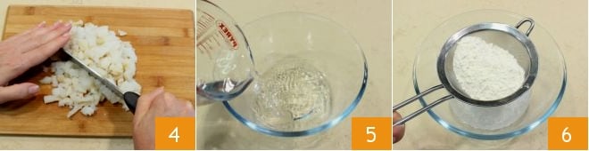 em seguida, corte em pedacinhos e pique com a faca 4. Coloque o peixe picado em uma tigela e reserve. Enquanto isso, prepare a massa: em um recipiente coloque a água fria 5 e a farinha peneirada 6.