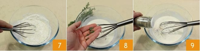 Misture bem a massa com o batedor para evitar a formação de grumos 7 até obter uma massa densa e homogênea. Adicione as folhas de tomilho 8 e ajuste o sal e a pimenta 9.