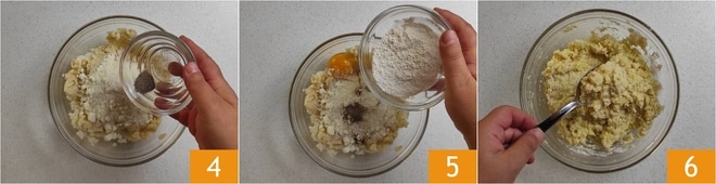 Adicione a pimenta 4, os ovos, a farinha 5 e misture até obter uma massa homogênea 6.