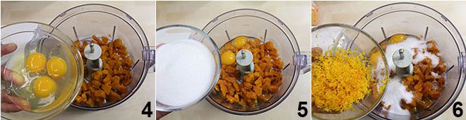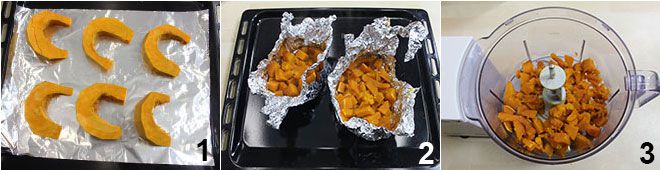 Para preparar os bolinhos doces de abóbora, primeiro cuide da abóbora, que deve ser cortada e limpa das sementes. Corte-a em fatias de 1 cm de espessura, envolva-as em papel alumínio e coloque-as no forno por uma hora a 200° 1, ou para acelerar o cozimento, corte-a em cubos crus e cozinhe-a no forno, sempre envolta em alumínio, por 40 minutos a 200° 2. Uma vez cozida, coloque a polpa de abóbora em um processador 3.