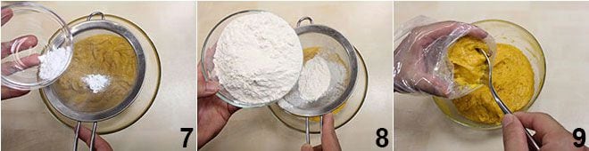 Peneire o fermento 7 e a farinha 8 na mistura, mexendo tudo bem até obter uma massa lisa e homogênea, que você transferirá para um saco de confeiteiro 9 descartável com bico liso.