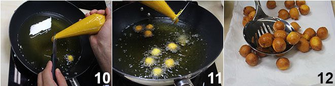 Neste ponto, aqueça o óleo em uma frigideira e forme bolinhas de massa de cerca de 2 centímetros, pressionando o saco de confeiteiro de cima. Como a massa ficará macia, mas ligeiramente pegajosa, use uma faquinha para soltá-la do bico do saco de confeiteiro 10. Proceda assim até que a massa acabe 11, lembrando que as frituras, caindo no óleo, devem ter o tamanho de uma noz. Espere que os bolinhos inflem, depois vire-os com uma concha e, quando estiverem bem dourados em toda a superfície, retire-os do óleo e coloque-os em um prato forrado com papel absorvente 12. Polvilhe os bolinhos doces de abóbora com um pouco de açúcar de confeiteiro e sirva-os ainda quentes!