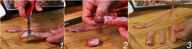 Proceda à limpeza dos peixes, eliminando a cabeça 1 e as vísceras 2 do peixe. No caso das cepolas, elimine as barbatanas dorsais e ventrais ao longo de todo o corpo cortando-as com uma tesoura, em seguida, corte o peixe em três partes.3.
