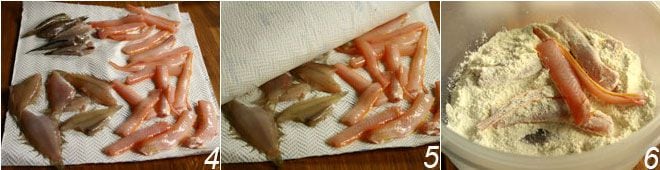Se necessário, enxágue rapidamente os peixes em água corrente 4, seque-os bem com papel toalha para deixá-los perfeitamente secos 5 e passe-os na farinha de semolina de grão grosso 6.