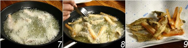 Frite os peixes em bastante óleo de sementes 7 (de preferência de amendoim) que você deve manter a uma temperatura constante de 175° sem jamais ultrapassá-la. Vire os peixes durante a fritura 8 e, uma vez dourados, escorra-os e coloque-os sobre papel toalha 9 para eliminar o excesso de óleo. Salgue e sirva imediatamente acompanhando a fritura com uma saladinha mista ou com batatas fritas deliciosas.