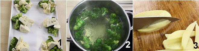 Para preparar a fritura mista de legumes e queijos, comece preparando os legumes: limpe e corte a couve-flor e o brócolis em pedaços pequenos 1, cozinhe os brócolis em água fervente por 3 minutos 2 e a couve-flor por 5 minutos, eles devem permanecer crocantes. Corte as batatas em fatias finas 3 e cozinhe-as por 1 minuto em água fervente com sal.