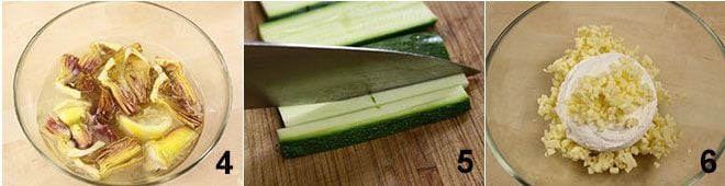 Agora limpe as alcachofras seguindo as instruções que Como limpar alcachofras, corte-as em quartos e coloque-as em uma tigela com água e limão para evitar que escureçam 4. Lave as abobrinhas e corte-as em fatias finas 5. Neste ponto, prepare os queijos: em uma tigela grande coloque a ricota, as fatias de queijo caciotta cortadas finamente e 2 colheres de sopa de provolone ralado, farinha, sal, pimenta, noz-moscada 6.