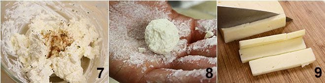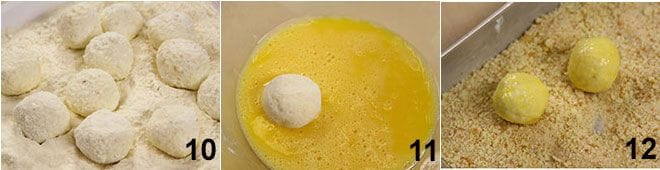 Comece a empanar os queijos: passe-os na farinha 10, depois no ovo 11 e finalmente na farinha de rosca 12 e reserve-os.