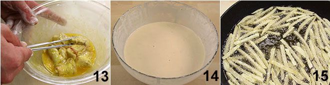 Proceda da mesma forma com a metade das alcachofras 13. Agora prepare a massa: em uma tigela, despeje a água e adicione a farinha aos poucos, mexendo com um batedor para não formar grumos 14, deixe a massa descansar na geladeira por cerca de meia hora. Tudo está pronto para fritar: coloque no fogo uma panela grande com bastante óleo de semente, assim que o óleo estiver quente, comece fritando primeiro as batatinhas 15 e depois deixe-as secar em papel absorvente.