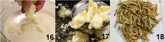 Imersa na massa os pedaços de couve-flor 16, de brócolis, as abobrinhas e as alcachofras restantes, frite-os 17 e deixe-os secar. Termine a fritura com os queijos e alcachofras empanados. Certifique-se de secar todos os legumes e queijos em um papel absorvente para eliminar o excesso de óleo 18. Sirva imediatamente a fritura de legumes e queijos quente e crocante!