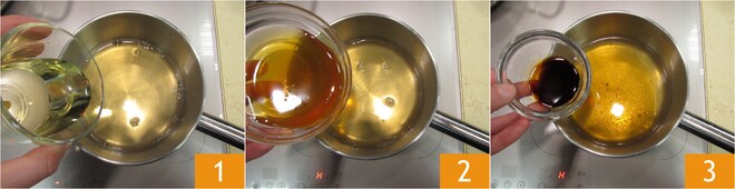 Para preparar a fritura de lulas com limão, coloque em uma panela o vinagre de maçã, o vinho 1, o mel 2, o molho de soja 3.