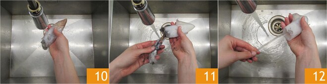 Agora limpe as lulas: lave-as em água corrente 10, separe a cabeça e retire as vísceras 11. Remova também o osso interno 12 e a pele.