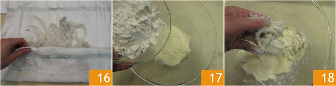Deixe-as secar em um pano de prato 16. Em uma tigela, misture farinha e sêmola 17. Enfarinhe as lulas 18.