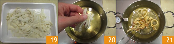 Conforme for enfarinhando, coloque-as em uma bandeja 19, enquanto isso aqueça o óleo para fritura, mergulhe as lulas 20 e frite o tempo necessário para dourá-las 21.