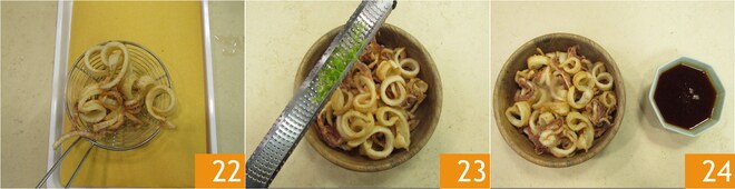 Escorra em papel absorvente e adicione sal 22, e por fim aromatize com limão ralado 23 e pimenta-do-reino. Sirva as lulas com a salsa agridoce 24.