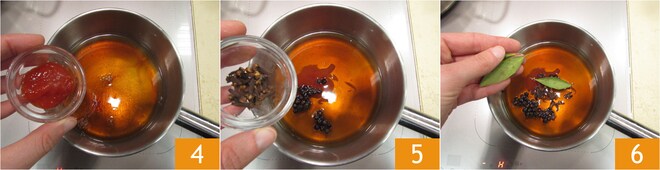 Adicione também o extrato de tomate 4, as bagas de zimbro, os cravos-da-índia 5 e as folhas de louro 6.