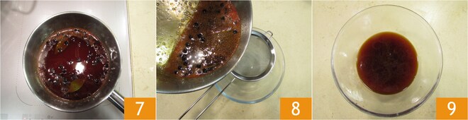 Leve ao fogo todos os ingredientes 7 e deixe reduzir um quarto do produto por cerca de uma hora. Coe o molho obtido através de uma peneira 8 e reserve 9.