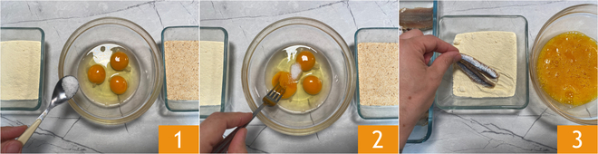 Para preparar a fritura de peixe na fritadeira sem óleo, recomendamos que você compre os peixes já limpos, ou pode limpá-los seguindo nossos guias: "Como limpar os camarões", "Como limpar lulas", "Como limpar as anchovas". Prepare os ingredientes para a empanagem: coloque a farinha em uma tigela, a farinha de rosca em outra e os ovos em uma terceira. Adicione uma pitada de sal aos ovos 1 e bata com um garfo 2. Agora seque todos os peixes com papel toalha e comece a empanar as anchovas: passe-as primeiro na farinha 3.