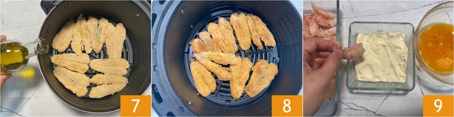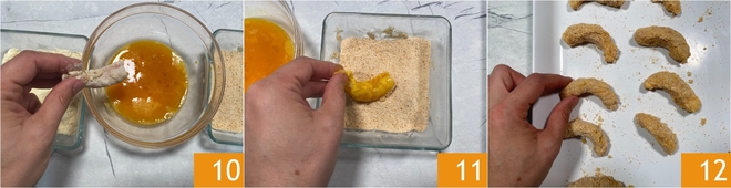 Mergulhe-os nos ovos 10 e, finalmente, cubra-os com a farinha de rosca 11. Coloque-os gradualmente na bandeja 12.