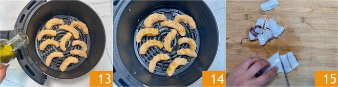 Quando você tiver empanado todos os camarões, coloque-os no cesto da fritadeira sem óleo, tempere com um pouco de óleo 13 e cozinhe, a 200° no modo crocante, por cerca de 7 minutos 14. Finalmente, dedique-se às lulas: corte-as em tiras de cerca de dois centímetros de largura 15.