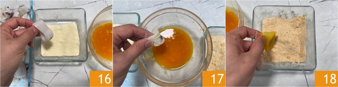 Proceda da mesma maneira para a empanagem: passe-as primeiro na farinha 16, depois nos ovos 17 e, finalmente, na farinha de rosca 18.