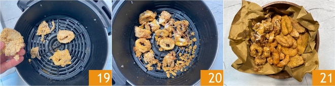 Coloque as lulas empanadas no cesto da fritadeira sem óleo 19 e cozinhe no modo crocante, à temperatura de 200°, por cerca de 6 minutos 20. Salgue a gosto, borrife com suco de limão e sirva imediatamente sua fritura de peixe na fritadeira sem óleo 21!