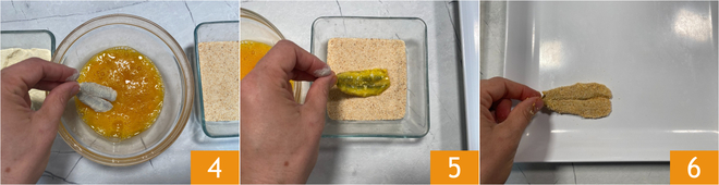 Em seguida, mergulhe-as nos ovos 4 e, finalmente, cubra-as com a farinha de rosca 5. Continue dessa maneira, colocando-as gradualmente em uma bandeja 6.