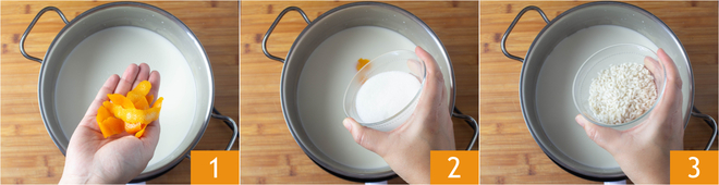Para preparar os bolinhos de arroz, primeiramente aqueça o leite em uma panela. Quando atingir a fervura, adicione a casca de laranja 1, o açúcar 2 e o arroz 3.