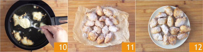 Em uma frigideira, aqueça o óleo a uma temperatura de 160-170°C e coloque algumas colheradas da massa no óleo 10. Cozinhe os bolinhos, poucos de cada vez para não baixar muito a temperatura do óleo, por 1-2 minutos de cada lado, até que fiquem dourados. À medida que os frita, coloque os bolinhos sobre papel absorvente para eliminar o excesso de óleo. Uma vez mornos, polvilhe com açúcar de confeiteiro 11. Seus bolinhos de arroz estão prontos para serem degustados 12!