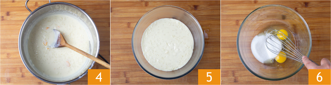 Cozinhe em fogo baixo por 30 minutos, mexendo frequentemente 4. Retire a casca de laranja, transfira tudo para uma tigela 5 e deixe esfriar. Enquanto isso, bata os ovos com o açúcar 6. Você pode usar um batedor manual ou uma batedeira elétrica.