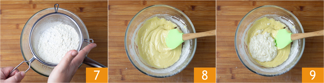 Adicione a farinha e o fermento peneirados 7, em seguida misture energicamente até obter uma massa lisa e sem grumos 8. Incorpore o creme de arroz e misture novamente 9.