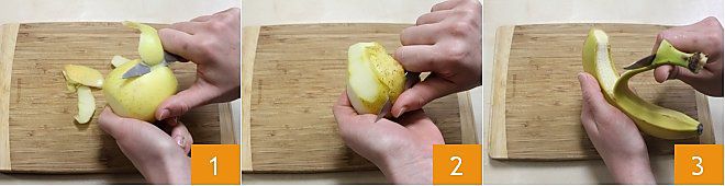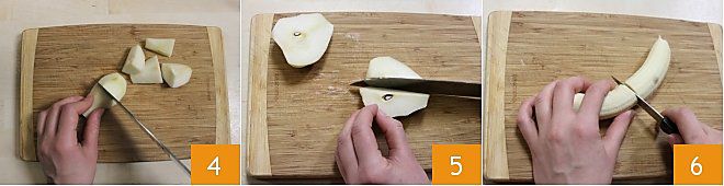 Para preparar a fruta frita caramelizada, lave e descasque as maçãs, as peras e as bananas (1-2-3);
