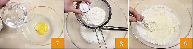 Separe as gemas das claras e reserve estas últimas. Bata as gemas com a água 7 e adicione também a farinha e o fermento peneirados 8. Bata bem com um batedor para evitar a formação de grumos 9.