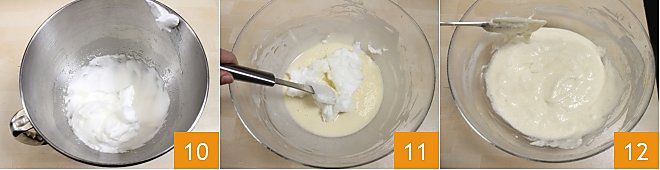 Bata as claras em neve com uma pitada de sal 10 e adicione à massa delicadamente, mexendo de baixo para cima, para não desmontar (11-12).