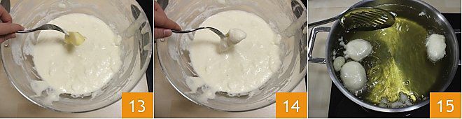 Aqueça o óleo de sementes em uma panela grande e, quando estiver pronto, mergulhe cada pedaço de fruta na massa, cobrindo-o completamente (13-14) e mergulhe-o no óleo quente 15.