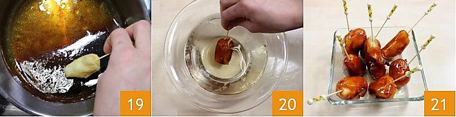 Quando o caramelo estiver pronto, espete cada pedaço de fruta frita com um palito e mergulhe-o rapidamente no caramelo 19. Escorra o excesso de caramelo e mergulhe o pedaço de fruta na água gelada, que você preparou em uma tigela, para solidificar o caramelo 20. Coloque a fruta frita caramelizada em um prato de servir e sirva 21.