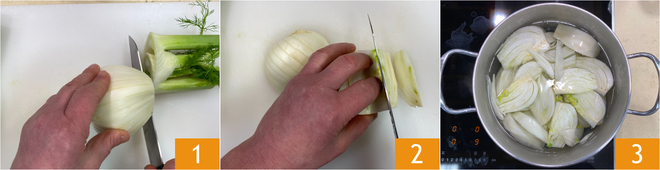 Para preparar o funcho gratinado à mediterrânea, primeiro limpe o funcho 1 e corte-o em fatias bem grossas 2. Escalde o funcho em água salgada por 5 minutos 3.<\p>