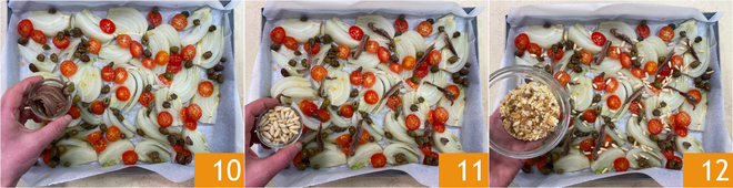 Acrescente também as anchovas 10 e os pinhões 11, depois polvilhe com pão ralado 12 e orégano seco.<\p>
