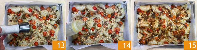 Salgue 13, apimente e finalmente tempere com um fio de óleo 14. Asse em forno estático pré-aquecido a 180°C por cerca de 20 minutos ou até que se forme uma crosta dourada na superfície. Retire do forno e sirva imediatamente o seu funcho gratinado à mediterrânea 15!<\p>