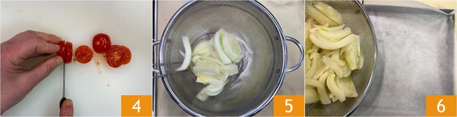 Enquanto isso, corte os tomatinhos em fatias 4. Escorra o funcho 5 e distribua-o em uma assadeira forrada com papel manteiga 6.<\p>