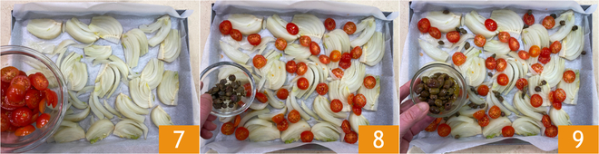Adicione os tomatinhos 7, as alcaparras 8 e as azeitonas 9.<\p>