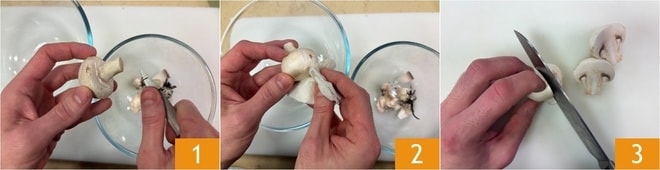 Para preparar os cogumelos em azeite, comece limpando os cogumelos champignon: retire a base do talo 1 e, com um pano ou toalha de papel úmida, limpe levemente a superfície 2 (se os cogumelos estiverem muito sujos, pode-se optar por uma lavagem rápida em água fria por alguns segundos). Divida-os ao meio 3.