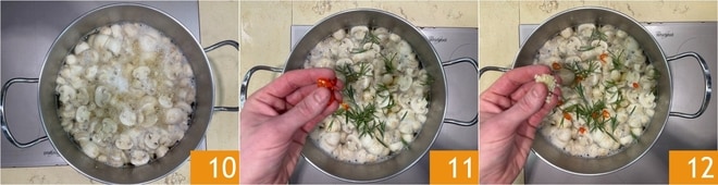 Quando a solução voltar a ferver 10, adicione o alecrim, a pimenta 11 e o alho picado 12.