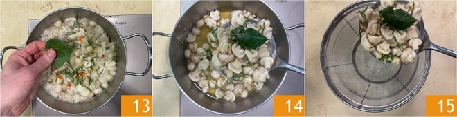 Adicione também as folhas de louro 13 e misture. Espere 1 minuto, então deixe esfriar um pouco e escorra os cogumelos com uma escumadeira 14, transferindo-os para um escorredor 15.