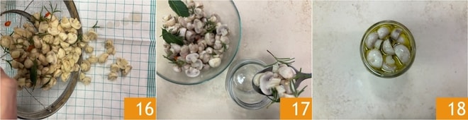 Seque tudo em um pano limpo 16, pressionando bem. Em seguida, pegue um pote de vidro de 500 ml perfeitamente limpo com tampa nova. Encha-o com os cogumelos, pressionando ligeiramente 17. Em seguida, preencha até a superfície com azeite de oliva extra virgem em duas etapas, aguardando que o azeite se distribua por todo o pote 18.