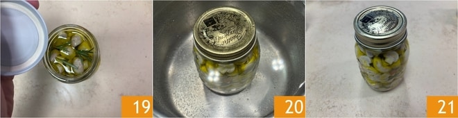 Feche com a tampa 19 e mergulhe em uma panela com água fria. Acenda o fogo e leve para ferver por cerca de 60 minutos. Após esse tempo, deixe os potes esfriarem na própria água. Para ter certeza de que a operação "sous vide" foi bem-sucedida, basta verificar se a tampa não faz clique ao pressionar com os dedos.